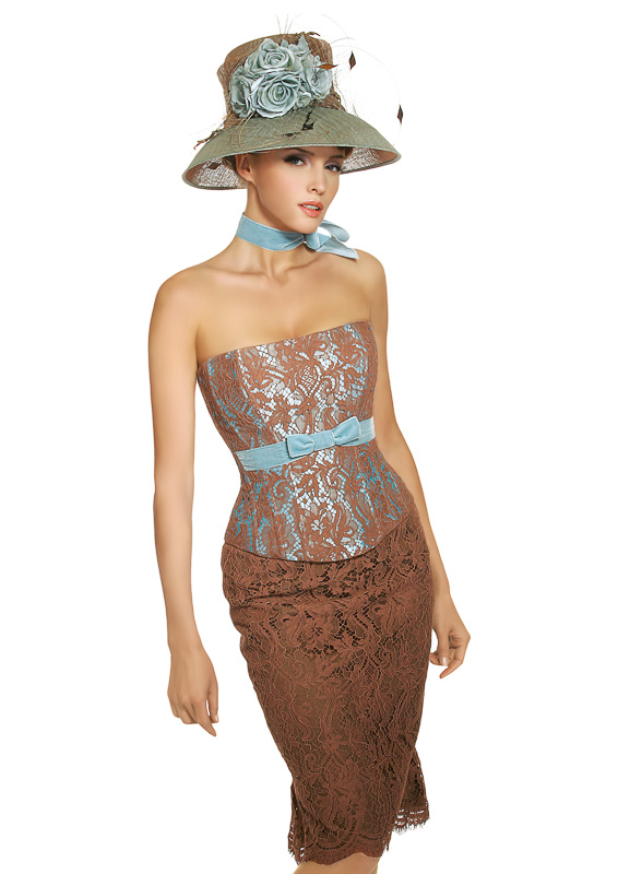 Korsett: M "Jolie" Dupionseide türkis mit Spitzenüberzug choco • Rock: R 65 Spitzenrock choco