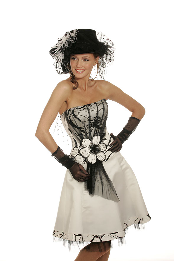 Korsett: M 36 SL2 Satin Print Point grau / Satin ecru • Rock: R 29 Satin ecru