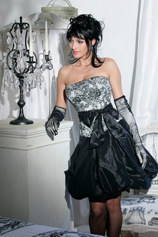 Korsett: M 90 Jacquard Lurex Rib schwarz • Rock: R 55 Elastic-Satin perle