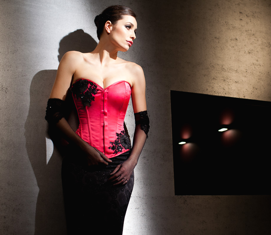 Korsett: M 55 Satin himbeer • M 55 Jacquard Lurex Rib schwarz • Rock: R 36 Jacquard Lurex Pretty schwarz • R 55 Elastic-Satin deep pink