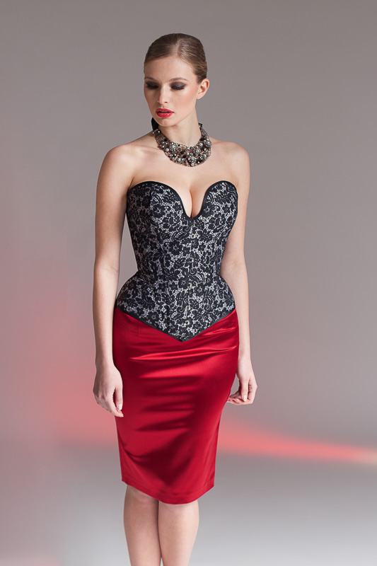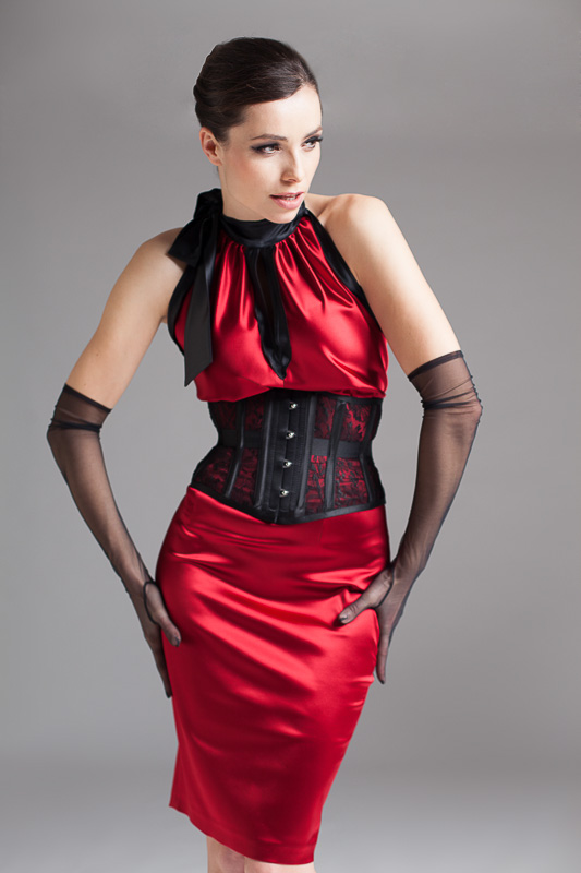 Korsett: M 41/15U Tüll schwarz mit Spitze (15) überzogen / Satin schwarz • Rock: R 55 Elastic-Satin rot • Top: Top 3 Elastic-Satin rot/schwarz