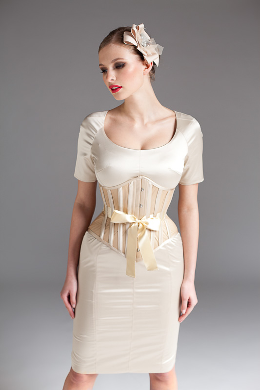 Korsett: M 51 SL Tüll haut / Satin shell Schleife champagner • Kleid: Etuikleid 2 Elastic-Satin shell