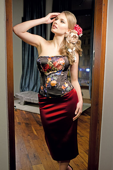 Korsett: M 1/24 Satin Print barock Rosen • Rock: R 55 Elastic-Satin rot