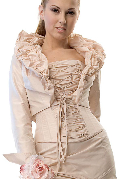 Ein sehr vielseitig verwendbares Basismodell. Es wird grundsätzlich aus Taftstoffen gefertigt, die im vorderen Bereich dekorativ gerafft sind, ein optisch interessanter und sehr modischer Akzent. Dieses Modell ist sehr beliebt, da es vom Material her sehr geschmeidig und dementsprechend tragefreundlich ist.