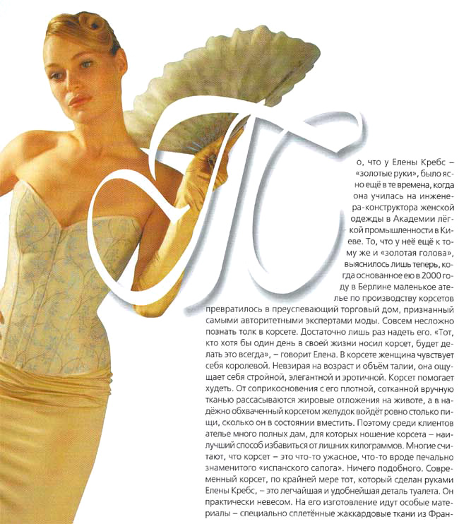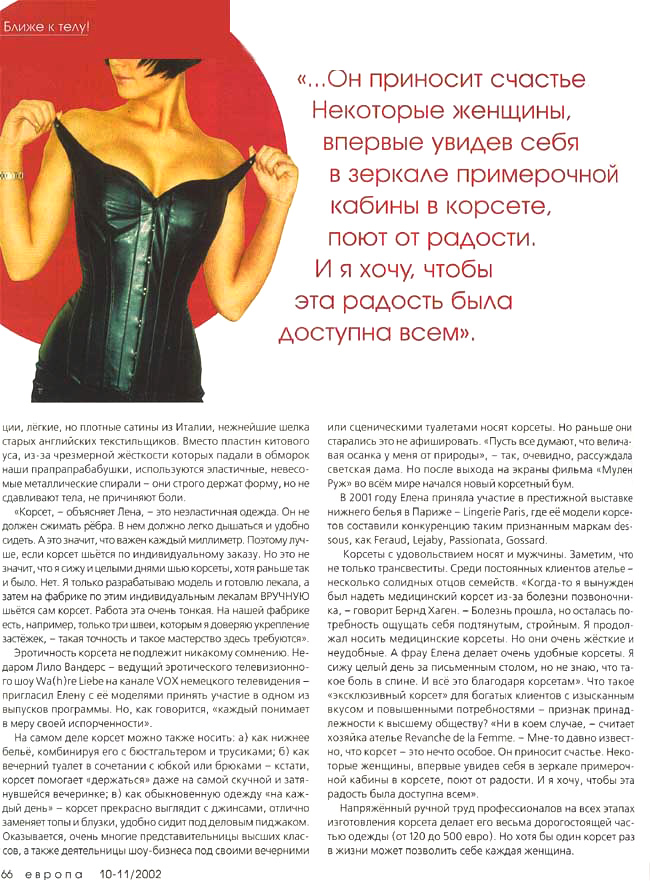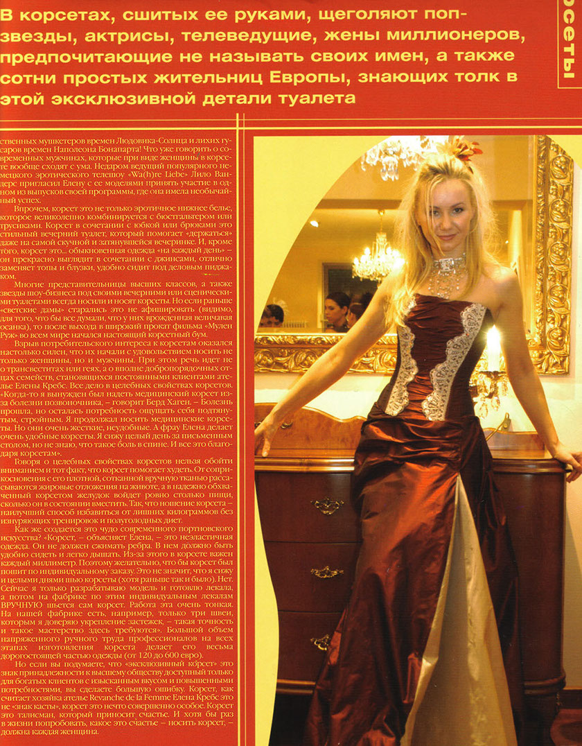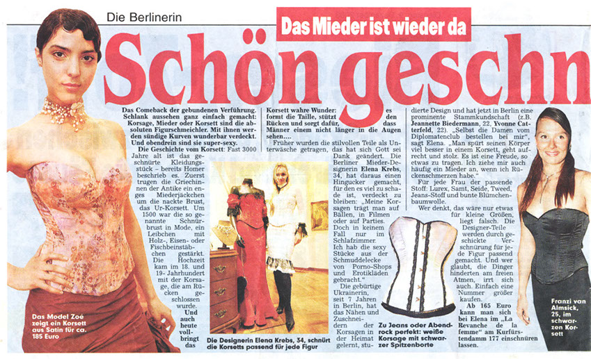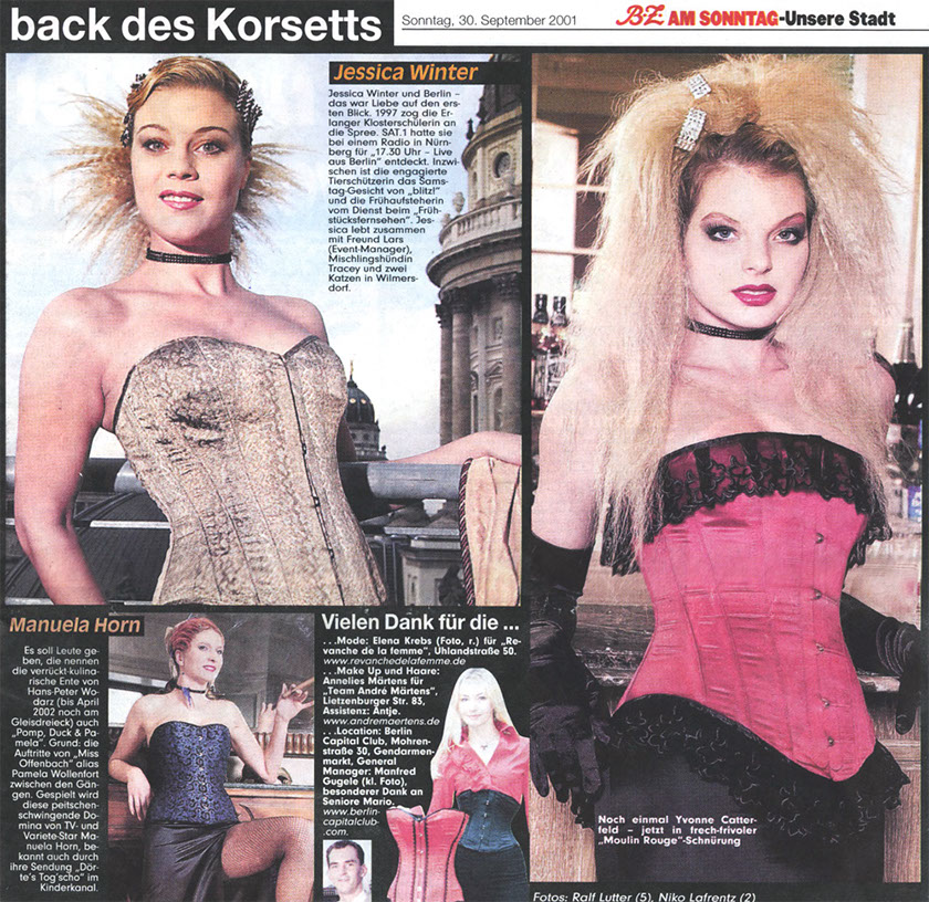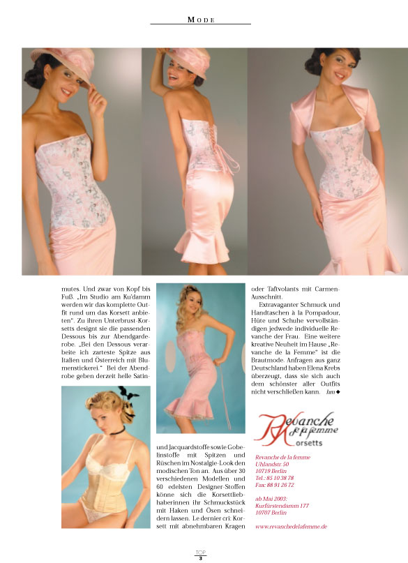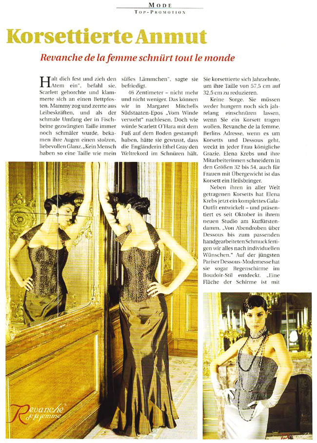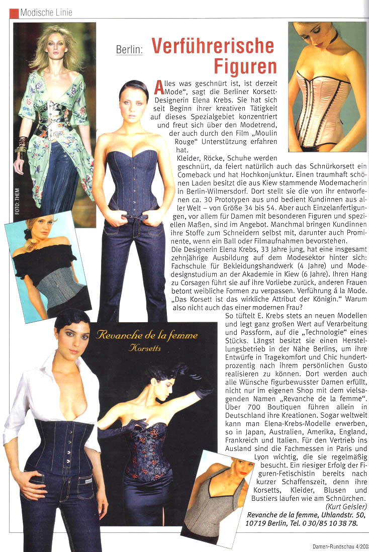 Unter dem Label „Revanche de la femme“ entstehen individuell erschaffene Korsetts - unverwechselbare Einzelstücke - Unikate für Theater, Fernsehen, Filmproduktionen, Shows, Bühnenaufführungen und individuelle Persönlichkeiten wie Sängern und Schauspielern.