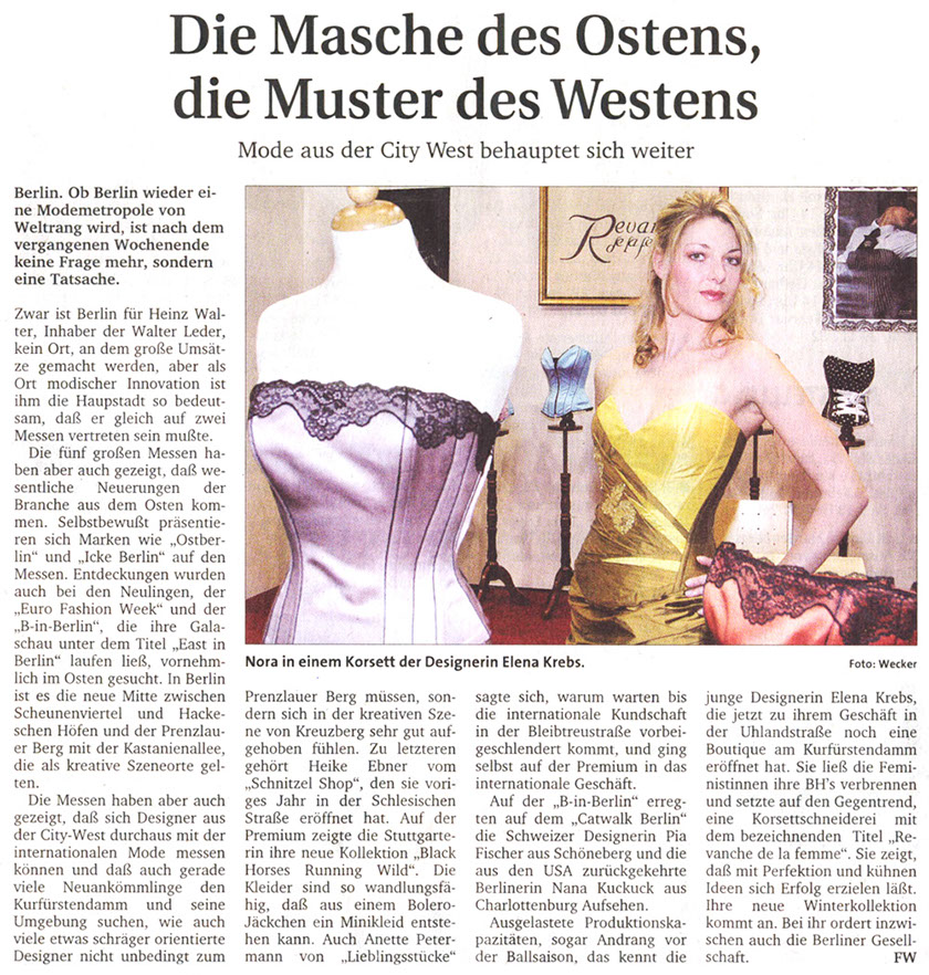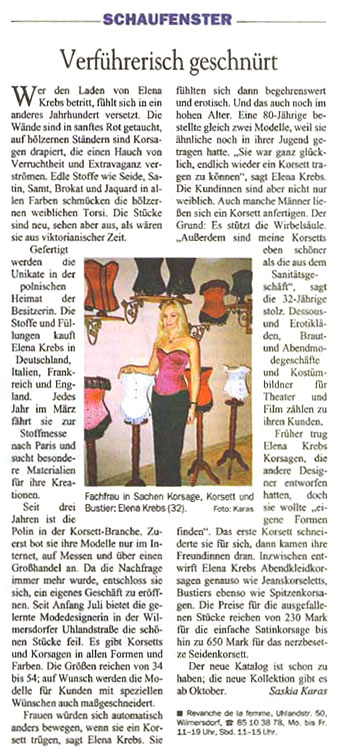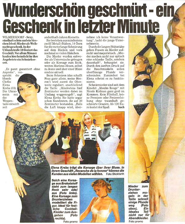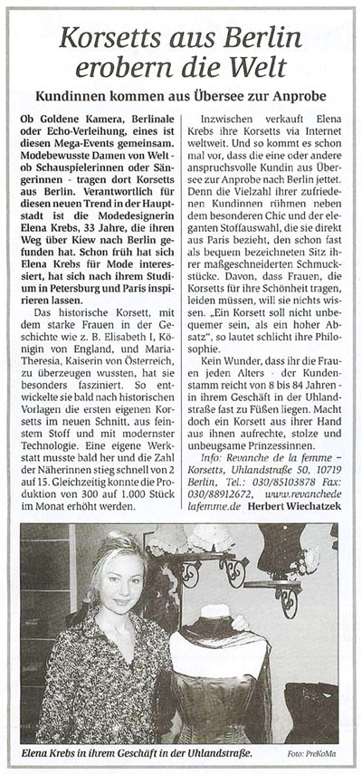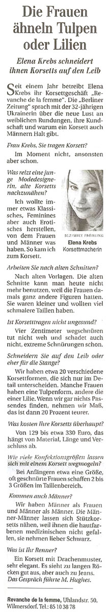 Revanche de la femme ist seit 1999 führend im Bereich hochwertiger Designer-Korsetts, nicht nur in Berlin. Diese werden durch passende Accessoires, wie z.B. Röcke, Boleros oder Stolas ergänzt. Für unsere mehr als 75 verschiedenen Schnitte für Korsetts und für 35 verschiedene Schnitte für Röcke und auch weitere ergänzende Bekleidungsmodelle verwenden wir über 260 unterschiedliche edle Stoffe und Farben, die aus traditionsreichen Webereien in Italien, Frankreich und England stammen und zum Teil exklusiv für uns hergestellt werden. Weiterhin verwenden wir für unsere Korsetts kein Plastik, sondern ausschließlich hochwertiges flexibles und rostfreies Metall. Daneben zeichnen sich unsere Produkte durch ihre sehr genaue Passform, sowie durch die präzise, aufwändige und anspruchsvolle Verarbeitung aus.