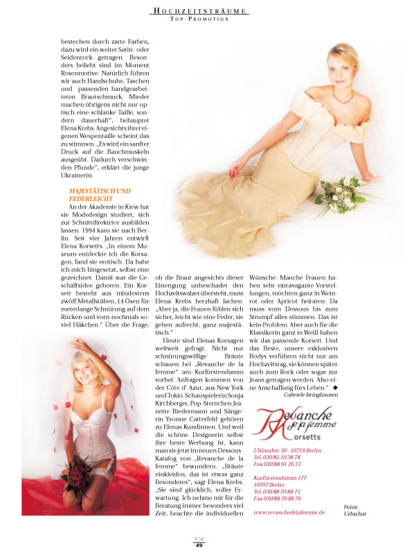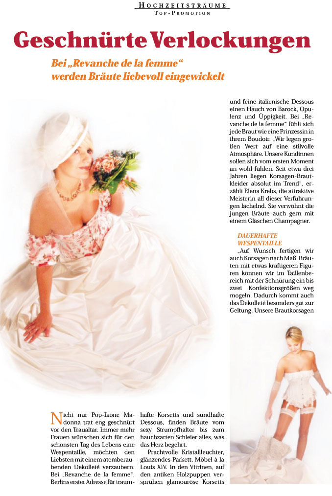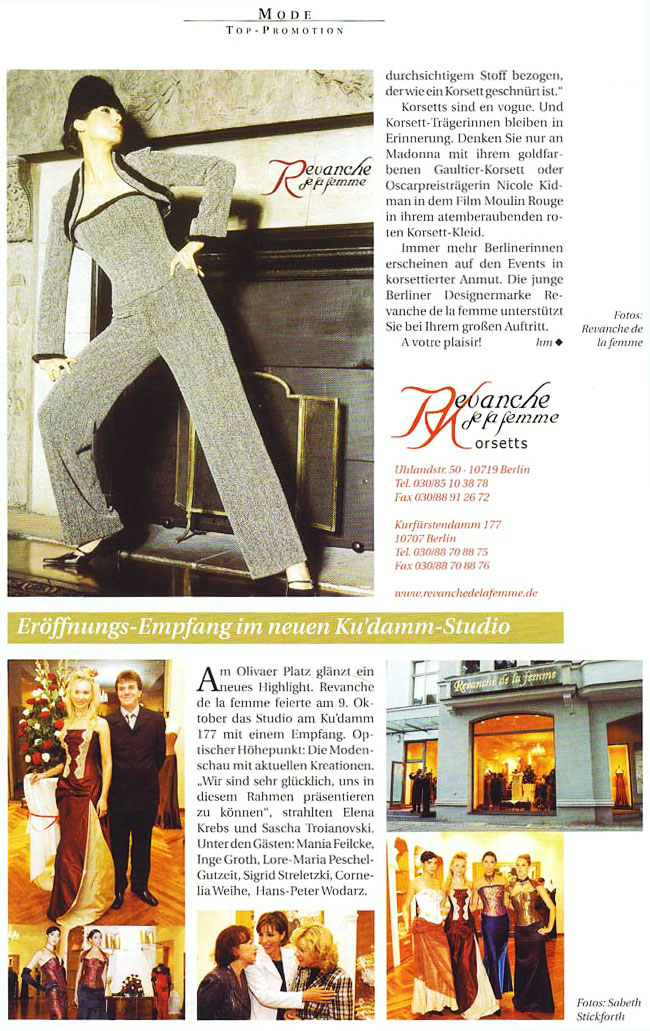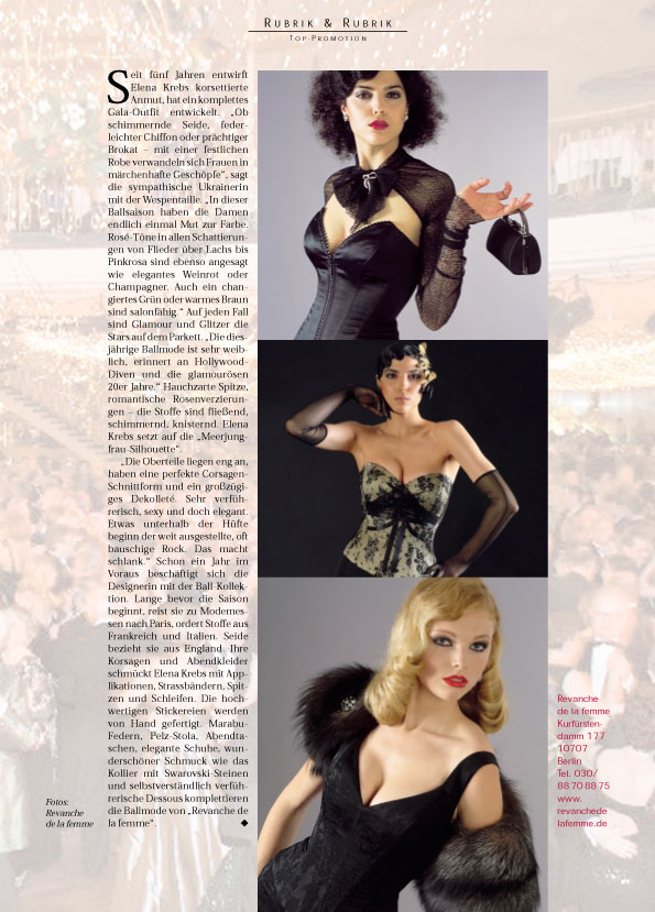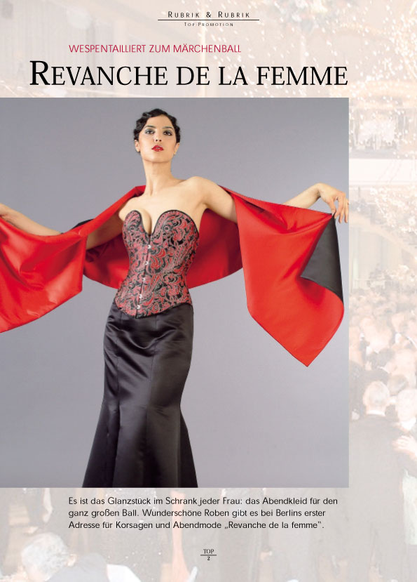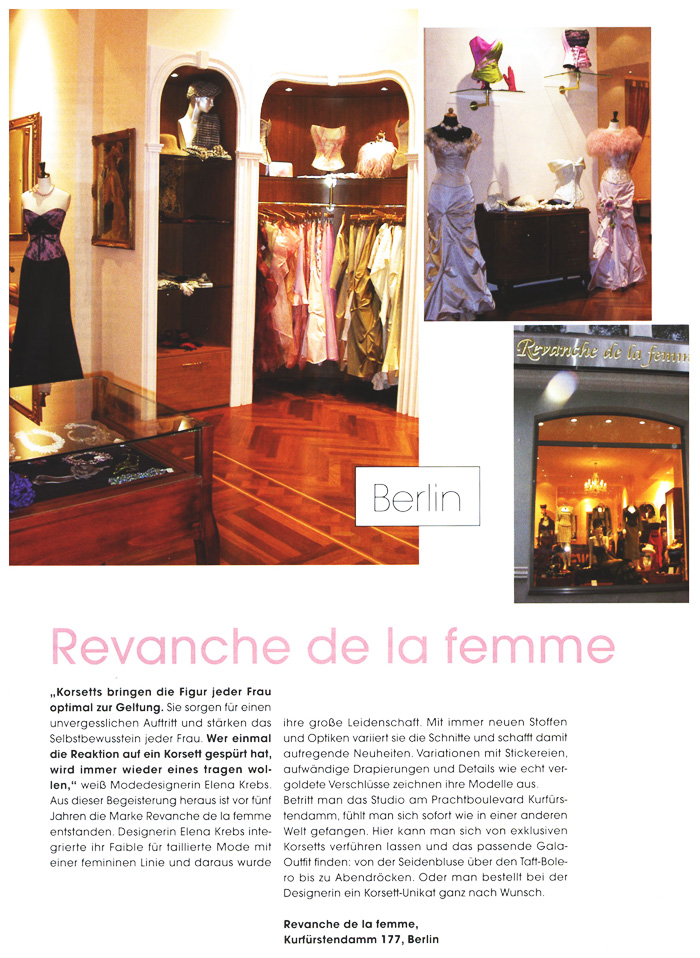 Unter dem Label „Revanche de la femme“ werden historische und individuell entwickelte maßgefertigte Korsetts, Dessous und Accessoires - absolut unverwechselbare Einzelstücke - Unikate für Theater, Fernsehen, Filmproduktionen, Museen, Schlösser und individuelle Persönlichkeiten gefertigt.