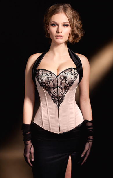 Dieses Korsett hat einen herzförmig gerundeten oberen Abschluss, der die Brust etwas höher ansetzend bedeckt. Es hat außerdem in unserer Kollektion die am besten ausgearbeiteten Cups.